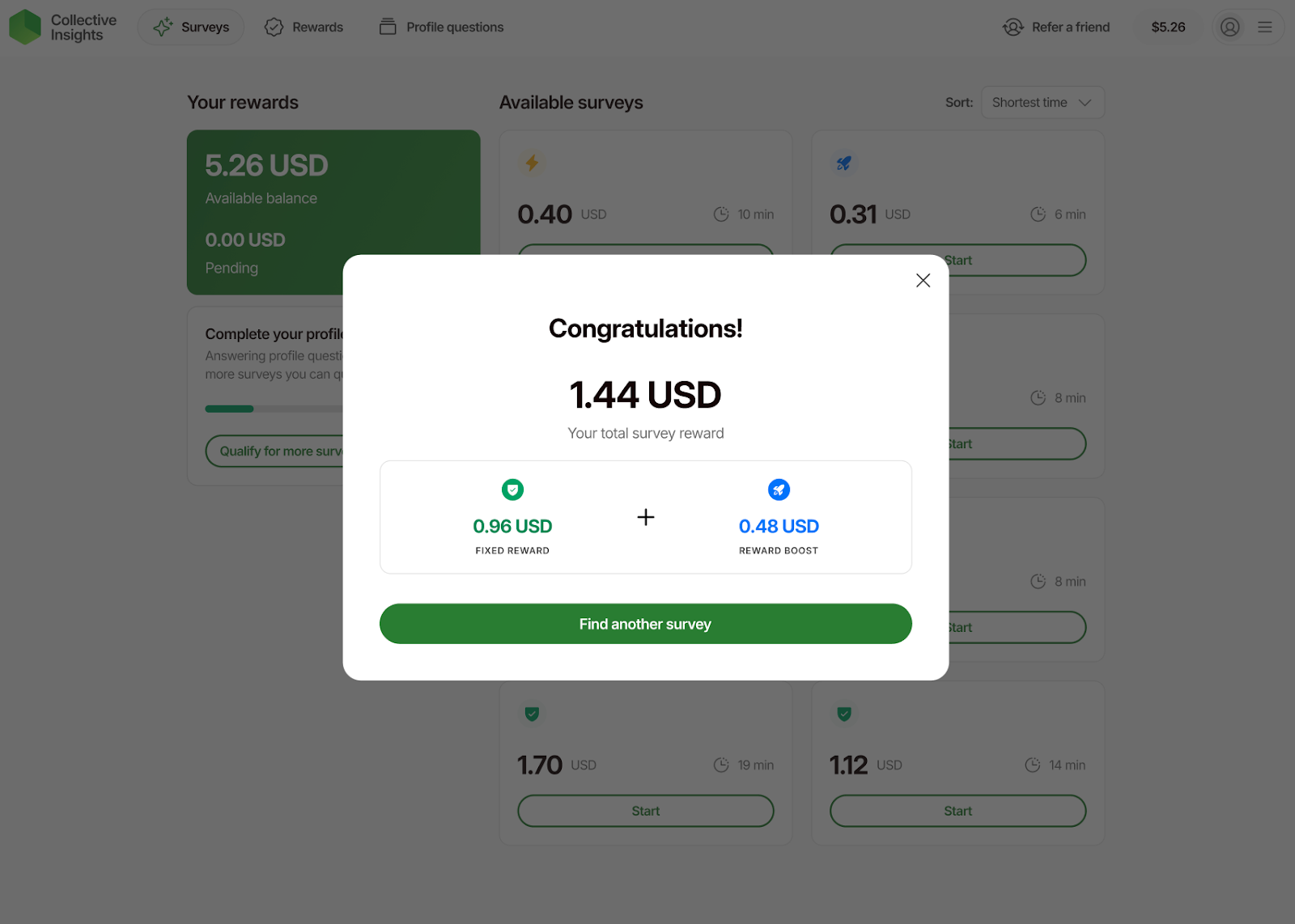 Once you have completed a survey, you will see a clear breakdown of your earnings - the fixed reward amount and the reward boost.