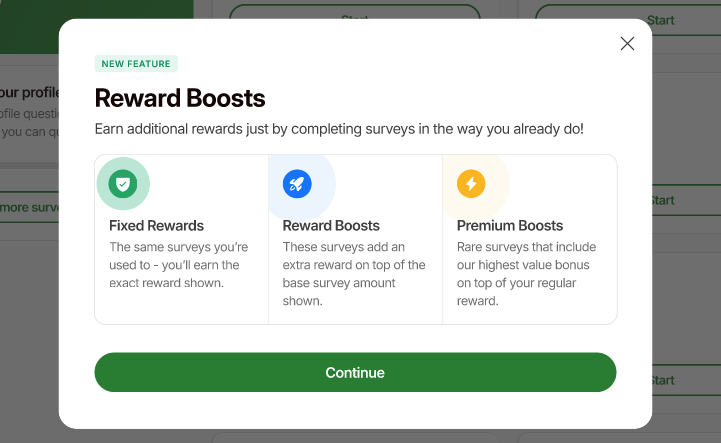 Reward boosts enable you to earn additional rewards by completing surveys in the same way you are already familiar with. They are set up and managed by your panel manager.