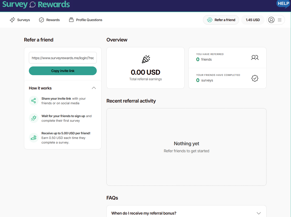 The referral program allows you to earn additional rewards by referring friends and family to become members and complete paid surveys.